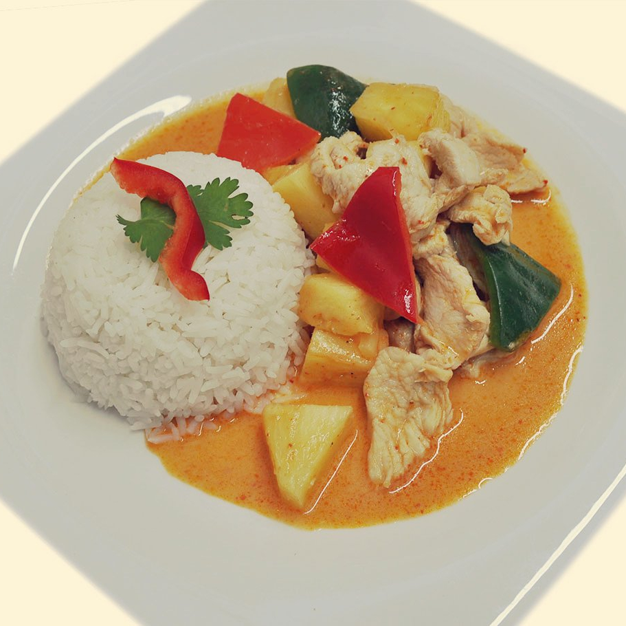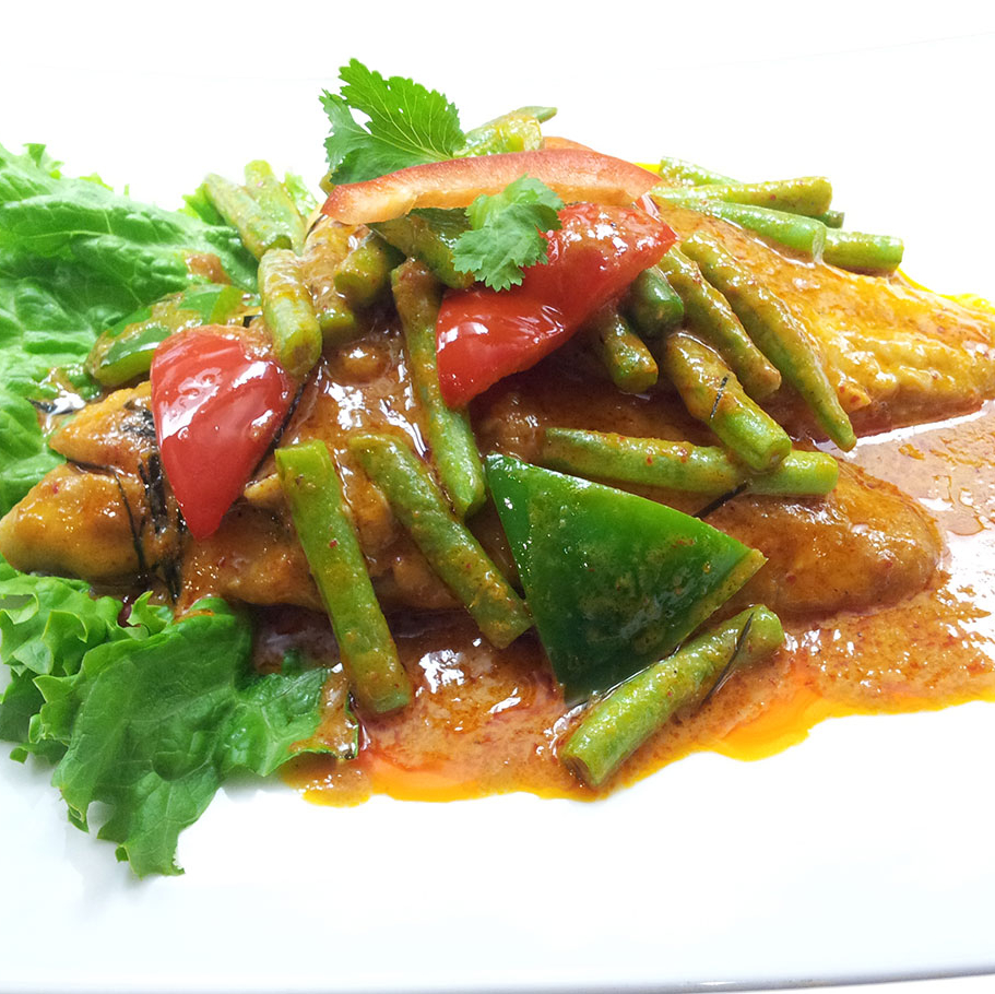 Green curry paste in coconut milk with bamboo shoots and basil leaves with your choice of meat.