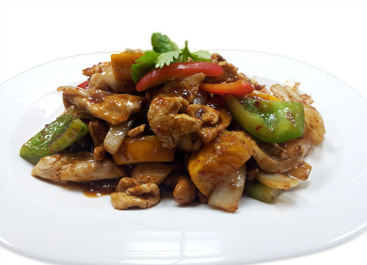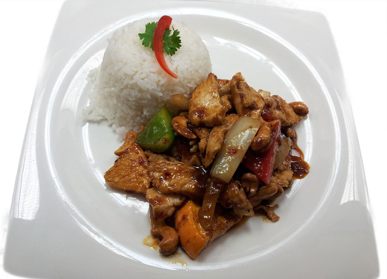 Stir-fried white onions, oranges chunks, sweet peppers, cashew nuts with special thai chilli sauce
