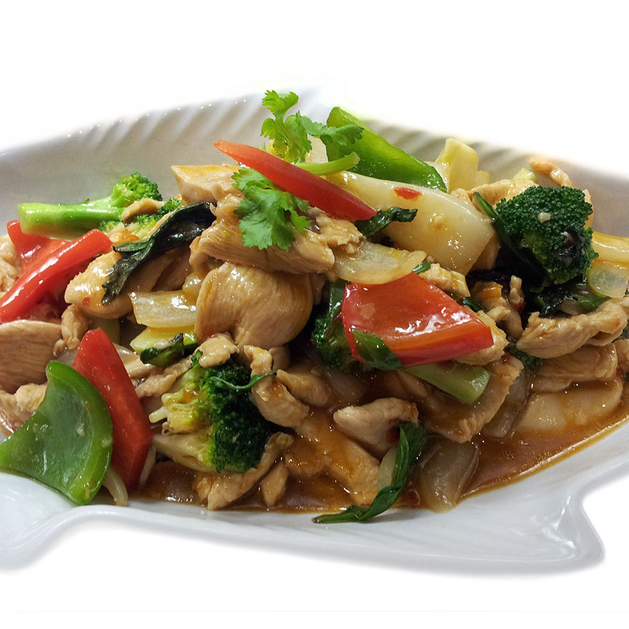 Rice noodles stir-fried in spicy basil sauce with green beans, onion, sweet peppers, baby corn fresh chilli, and basil leave with your choice of meat